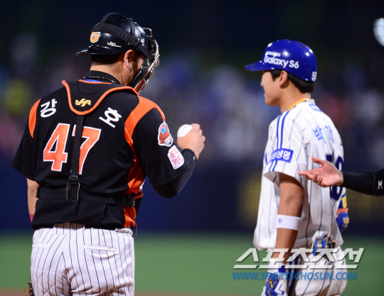 2일 오후 포항야구장에서 2015 프로야구 롯데와 삼성의 경기가 열렸다. 4회말 무사서 롯데 강민호가 이승엽이 안타 친 볼을 살펴보고 있다. 포항=김경민 기자 kyungmin@sportschosun.com / 2015.06.02.