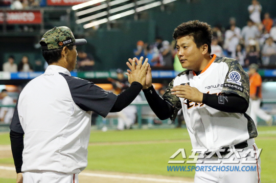 ◇한화 이글스 김성근 감독(왼쪽)과 주장 김태균이 6일 대전 한화생명 이글스파크에서 열린 kt 위즈와의 경기에서 6대4로 승리한 뒤 하이파이브를 하며 승리의 기쁨을 나누고 있다. 사진=한화 이글스 제공