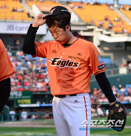 7일 오후 대전 한화생명 이글스 파크에서 2015 프로야구 KT와 한화의 경기가 열렸다. 한화 배영수가 3회초 수비를 마친 후 덕아웃으로 향하고 있다. 대전=김경민 기자 kyungmin@sportschosun.com / 2015.06.07. |