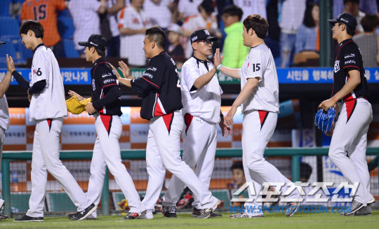 7일 오후 대전 한화생명 이글스 파크에서 2015 프로야구 KT와 한화의 경기가 열렸다. 4대3으로 승리한 후 KT 조범현 감독이 선수들과 하이파이브를 나누고 있다. 대전=김경민 기자 kyungmin@sportschosun.com / 2015.06.07. |