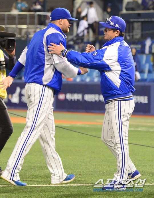 5일 오후 창원시 마산구장에서 2015 프로야구 삼성과 NC의 경기가 열렸다. 6대1로 승리한 후 삼성 류중일 감독이 클로이드와 하이파이브를 나누고 있다. 창원=김경민 기자 kyungmin@sportschosun.com / 2015.06.05.