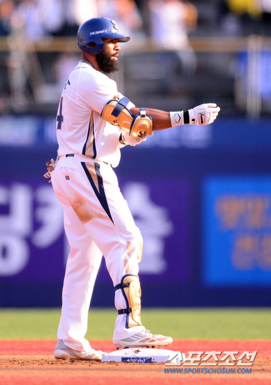 6일 오후 창원시 마산구장에서 2015 프로야구 삼성과 NC의 경기가 열렸다. 3회말 1사 만루서 NC 테임즈가 3타점 적시타를 친 후 보호장구를 풀고 있다. 창원=김경민 기자 kyungmin@sportschosun.com