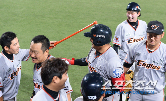 9일 대구 시민구장에서 KBO리그 삼성 라이온즈와 한화 이글스의 주중 3연전 첫 번째 경기가 열렸다. 한화 김태균이 연타석 홈런을 날렸다. 김태균은 8회 1사 2루에서 삼성 심창민을 상대로 중월 투런 홈런을 날렸다. 덕아웃에서 동료들의 축하를 받고 있는 김태균. 대구=송정헌 기자 songs@sportschosun.com