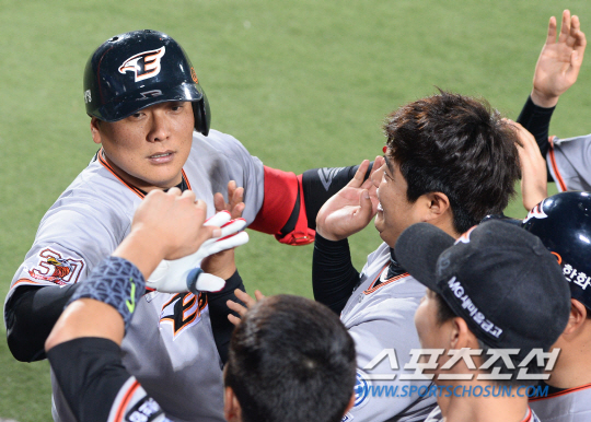 9일 대구 시민구장에서 KBO리그 삼성 라이온즈와 한화 이글스의 주중 3연전 첫 번째 경기가 열렸다. 한화 김태균이 연타석 홈런을 날렸다. 김태균은 8회 1사 2루에서 삼성 심창민을 상대로 중월 투런 홈런을 날렸다. 덕아웃에서 동료들의 축하를 받고 있는 김태균. 대구=송정헌 기자 songs@sportschosun.com/2015.06.09 |