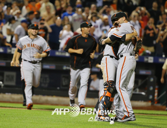 샌프란시스코 자이언츠의 루키 크리스 헤스턴이 경기를 마치고, 포수 버스터 포지와 감격의 포옹을 하고 있다. ⓒAFPBBNews = News1