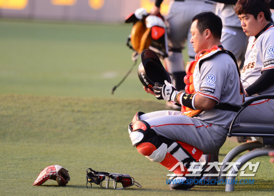 9일 대구 시민구장에서 KBO리그 삼성 라이온즈와 한화 이글스의 주중 3연전 첫 번째 경기가 열렸다. 삼성 윤성환과 한화 탈보트가 선발 맞대결을 펼쳤다. 경기를 준비하고 있는 한화 조인성. 대구=송정헌 기자 songs@sportschosun.com/2015.06.09 |