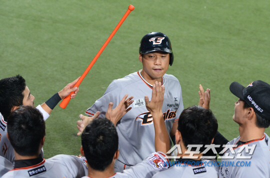 11일 대구 시민구장에서 KBO리그 삼성 라이온즈와 한화 이글스의 주중 3연전 마지막 경기가 열렸다. 한화 최진행이 6회 1사 1루에서 삼성 클로이드를 상대로 투런홈런을 날렸다. 덕아웃에서 동료들과 하이파이브를 나누고 있는 최진행. 대구=송정헌 기자 songs@sportschosun.com