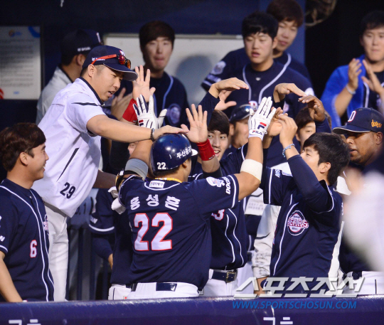11일 오후 서울 잠실야구장에서 2015 프로야구 두산과 LG의 경기가 열렸다. 4회초 무사서 두산 홍성흔이 우중월 솔로홈런을 친 후 유희관 등 동료들과 환호하고 있다. 잠실=김경민 기자 kyungmin@sportschosun.com / 2015.06.11.