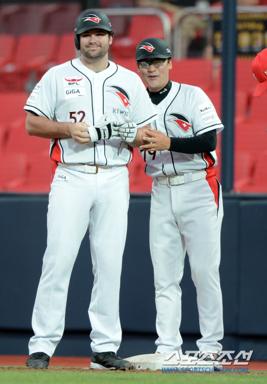 kt와 SK의 2015 KBO리그 주중 3연전 마지막 경기가 4일 수원 kt위즈파크에서 열렸다. 3회말 kt 댄 블랙이 좌전안타를 치고 진루하자 김민재 1루 코치가 미소를 짓고 있다. 수원=허상욱 기자 wook@sportschosun.com/2015.06.04/