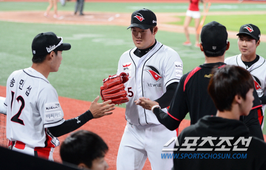 3일 수원 케이티위즈파크에서 KBO리그 kt와 SK의 경기가 열렸다. kt 선발 정대현이 두 경기 연속 호투를 펼쳤다. 정대현은 7이닝 2실점 호투를 펼쳤다. 마운드를 내려오며 동료들과 하이파이브를 나누고 있는 정대현. 수원=송정헌 기자 songs@sportschosun.com/2015.06.03