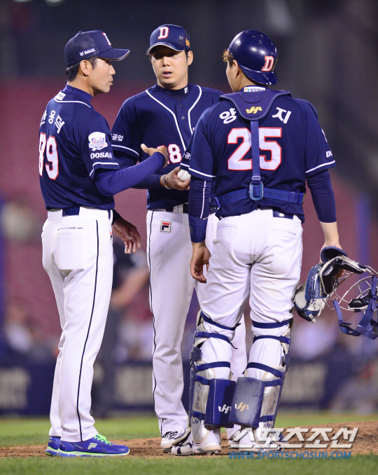 10일 오후 서울 잠실야구장에서 2015 프로야구 두산과 LG의 경기가 열렸다. 6회말 무사 1,2루서 두산 장원준이 마운드에 오른 한용덕 코치와 이야기를 나누고 있다. 김경민 기자 kyungmin@sportschosun.com / 2015.06.10. |