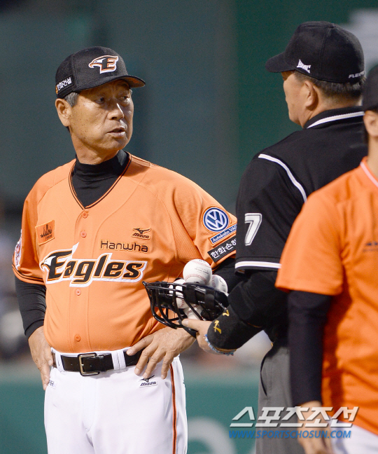 김성근 감독은 12일 대전 LG전 3-5로 뒤진 3회 2사 주자 1,2루 상황에서 대타 김태완이 3구 삼진을 당하자 바로 뛰어나와 강하게 항의했다.