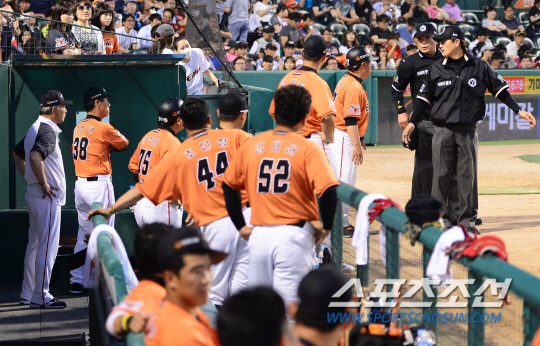 구심 문승훈씨는 LG 두번째 투수 임정우의 변화구(커브)가 스트라이크 존을 통과했다고 봤다. 포수 조윤준의 포구 위치는 좀 낮았다. 김성근 감독이 급하게 나와 문승훈씨에게 강하게 항의했다. 볼이라고 본 것이다. 그리고 공수 교대 시간에 한화 선수들이 바로 필드로 나오지 않았다. 한화 벤치에서 선수들이 수비 위치