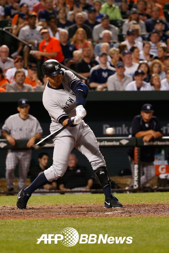 뉴욕 양키스 간판타자 알렉스 로드리게스가 14일(한국시각) 미국 메릴랜드주 볼티모어 캠든야드에서 열린 볼티모어 오리올스와의 원정경기에서 메이저리그 사상 3번째로 '통산 2000타점' 고지를 돌파했다. 2-4로 뒤지던 6회초 무사 1루 때 나와 2점 홈런을 치면서 '2001타점'째를 올렸다. 이날 로드리게스가 홈런을 치는 장면. ⓒAFPBBNews = News1