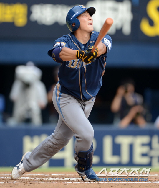 두산과 NC의 2015 KBO 리그 주말 3연전 마지막 경기가 14일 잠실구장에서 열렸다. 3회초 2사 2루 NC 나성범이 두산 유희관의 투구를 받아쳐 우측담장을 넘어가는 선제 2점홈런을 날리고 있다. 잠실=허상욱 기자 wook@sportschosun.com/2015.06.14/ |