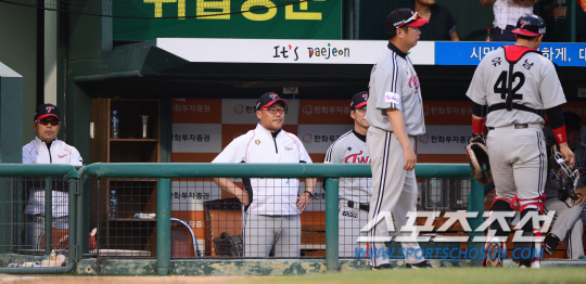 양상문 LG 감독이 무사 만루 상황에서 마운드로 올라갔다. 내야수 전원을 소집해 안정된 수비를 지시했다. 또 루카스에게는 흥분하지 말고 차분하게 던질 걸 주문했다. 루카스는 강경학을 직구로 헛스윙 삼진, 정근우를 변화구로 헛스윙 삼진 처리했다. 또 그는 김태균의 총알 같은 직선 타구를 감각적으로 잡아냈다. 루카스는 가볍게 옆구리 통증을 호소하면서 마운드를 내려갔다.