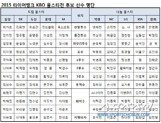 한편 드림 올스타의 삼성 구자욱과 나바로, 나눔 올스타의 NC 테임즈와 넥센 김민성, 김하성 등 5명은 올스타 베스트 선정과 함께 생애 첫 올스타전 출전에 한 발 다가서게 됐다. 구단 별로는 삼성이 6명으로 가장 많고, 한화가 5명, 넥센이 3명으로 그 뒤를 이었다. NC, SK, 두산, 롯데, KIA가 각각 2명씩이며 LG와 kt는 한 명도 선두에 오르지 못했다.