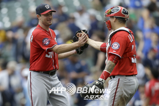 워싱턴 내셔널스의 에이스 맥스 슈어저가 15일(한국시각) 밀워키 브루어스와의 경기에서 완봉승을 거둔 직후 포수 호세 로바톤과 손을 맞잡고 기뻐하고 있다. ⓒAFPBBNews = News1