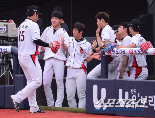 16일 오후 경기도 수원KT위즈파크에서 2015 프로야구 NC와 KT의 경기가 열렸다. 1회초 수비를 마친 KT 정대현이 동료들과 하이파이브를 나누고 있다. 수원=김경민 기자 kyungmin@sportschosun.com/ 2015.06.16.