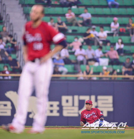 17일 오후 서울 잠실야구장에서 2015 프로야구 KIA와 LG의 경기가 열렸다. 3회말 1사 3루서 박용택의 좌익수 플라이 때 홈으로 쇄도하던 황목치승과 충돌한 이영재 주심이 부상으로 교체되는 동안 KIA 이범호가 그라운드에 앉아 휴식을 취하고 있다.잠실=김경민 기자 kyungmin@sportschosun.com
