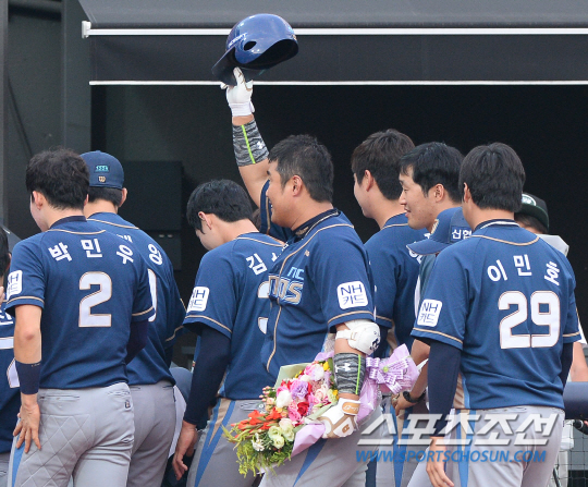 18일 수원 케이티위즈파크에서 KBO리그 kt 위즈와 NC 다이노스의 경기가 열렸다. kt가 NC에 2연승하면 시리즈 스윕승에 도전한다. kt 정성곤과 NC 손민한이 선발 맞대결을 펼쳤다. 1회 무사 2루에서 NC 이호준이 개인통산 300호 홈런포를 날렸다. 덕아웃에서 팬들에게 인사를 건내고 있는 이호준. 수원=송정헌 기자 songs@sportschosun.com