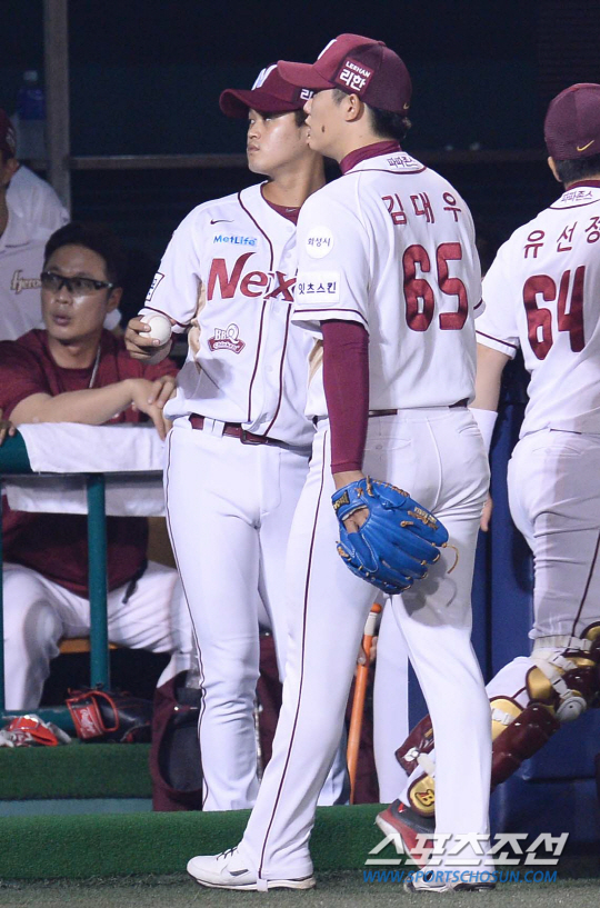 2015 KBO리그 넥센히어로즈와 롯데 자이언츠의 경기가 16일 서울 목동야구장에서 열렸다. 넥센 투수 김대우가 롯데 6회초 무사 김주현 타석때 손가락 부상으로 교체된 선발 김택형에 이어 마운드에 올랐다가 롯데의 항의로 덕아웃으로 돌아가고 있다. 야구규약에 따르면 이닝이 바뀌고 첫 타자를 끝까지 상대 못한 투수가 교체될경우 같은 유형 (왼손투수-왼손투수)의 투수로만 교체 가능하다. 목동=최문영 기자 deer@sportschosun.com