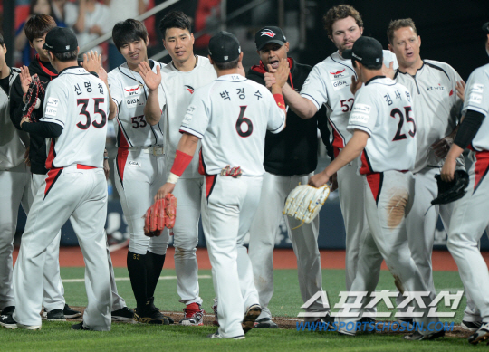 경기도는 10구단 창단 유치전 때 독립리그 창설을 약속했지만 실행하지 않고 있다. 사진은 17일 수원 kt위즈파크에서 열린 NC 다이노스전에서 선발 전원안타를 기록하며 승리한 kt 선수들이 하이파이브를 하는 모습. 수원=허상욱 기자 wook@sportschosun.com/2015.06.17/