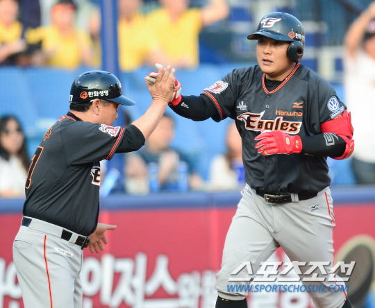 한화 이글스와 NC 다이노스의 2015 프로야구 경기가 19일 마산구장에서 열렸다. 1회초 1사 1, 3루 한화 김태균이 좌중월 스리런포를 치고 들어오며 김광수 코치의 축하를 받고 있다. 한화는 선발투수로 3승 3패 방어율 7.28의 배영수를 내세웠다. NC는 7승 3패 방어율 3.47의 해커가 선발등판했다. 창원=정재근 기자 cjg@sportschosun.com