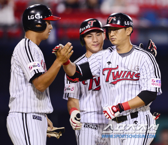 2015 프로야구 LG와 KIA의 경기가 16일 잠실 야구장에서 펼쳐 졌다. LG 7회말 2사 1,2루에서 박용택이 중월 3점 홈런을 치고 서상우와 하이파이브를 하고 있다. 잠실=조병관기자 rainmaker@sportschosun.com