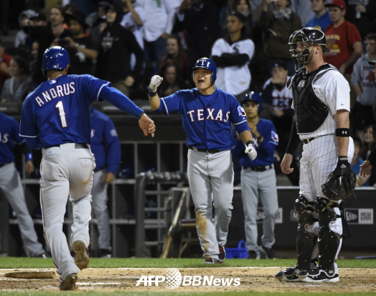 메이저리그 텍사스 레인저스의 추신수(가운데)가 20일(한국시각) 미국 시카고 셀룰러필드에서 열린 시카고 화이트삭스와의 원정경기에서 0-1로 뒤지던 9회초 볼넷으로 출루한 뒤 대타 미치 모어랜드의 역전 결승타로 득점한 뒤 기뻐하고 있다. ⓒAFPBBNews = News1 |