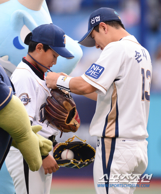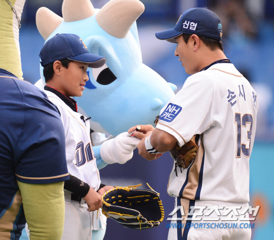 한화 이글스와 NC 다이노스의 경기가 열린 20일 마산구장. 경기 전 창원시 사파초등학교 야구부의 위주빈 학생이 마운드에 올랐다. 그리고 홈플레이트 포수석에는 손시헌이 자리를 잡고 앉았다. 위주빈 군이 힘차게 던진 공은 손시헌의 미트에 정확히 쏙 들어갔다.