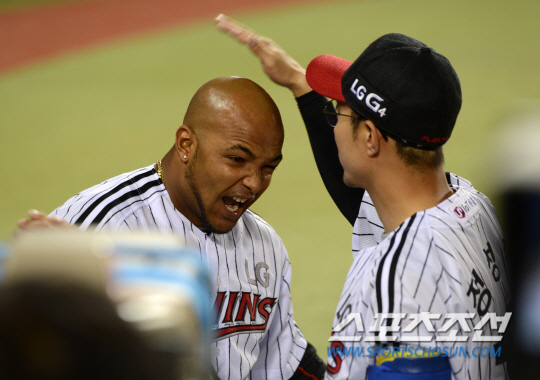 LG와 KIA의 2015 KBO 리그 주중 3연전 마지막 경기가 18일 잠실구장에서 열렸다. LG가 5대3으로 승리하며 주중 3연전을 위닝시리즈로 가져갔다. 6회말 솔로홈런을 날리며 KBO 첫 홈런을 기록한 히메네스가 홈인하며 정성훈과 기쁨을 나누는 모습. 잠실=허상욱 기자 wook@sportschosun.com/2015.06.18/