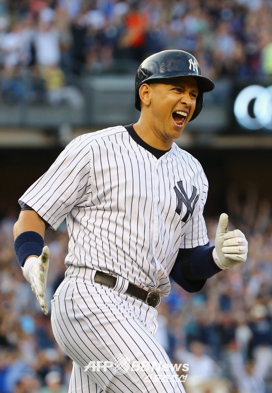 | 뉴욕 양키스 알렉스 로드리게스가 지난 20일(한국시각) 디트로이트 타이거스와의 경기에서 1회말 우월 솔로홈런을 때린 뒤 기뻐하고 있다. 통산 3000번째 안타가 된 이 홈런공을 잡은 팬은 로드리게스에게 돌려줄 마음이 없다고 밝혔다. ⓒAFPBBNews = News1 |