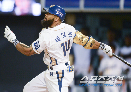 테임즈는 21일 창원 마산구장에서 열린 한화 이글스와의 홈경기에서 3-0으로 앞서던 8회말 쐐기 3점포를 터트렸다. 2사 1, 3루에서 타석에 나온 테임즈는 한화 필승조인 좌완 권 혁을 상대로 볼카운트 3B1S에서 5구째를 받아쳤다. 144㎞짜리 패스트볼이 가운데로 쏠린 것을 놓치지 않았다. 타구는 총알처럼 날아가 왼쪽 담장을 살짝 넘었다. 비거리 110m짜리 3점포.