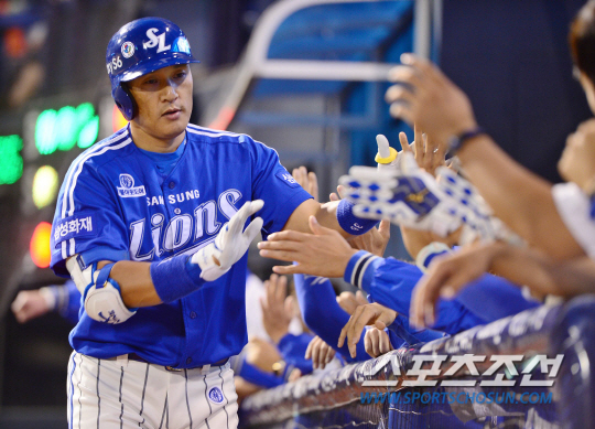 6일 오후 창원시 마산구장에서 2015 프로야구 삼성과 NC의 경기가 열렸다. 9회초 2사 1루서 삼성 이승엽이 좌중월 2점 홈런을 친 후 덕아웃에서 동료들과 하이파이브를 나누고 있다. 창원=김경민 기자 kyungmin@sportschosun.com / 2015.06.06.