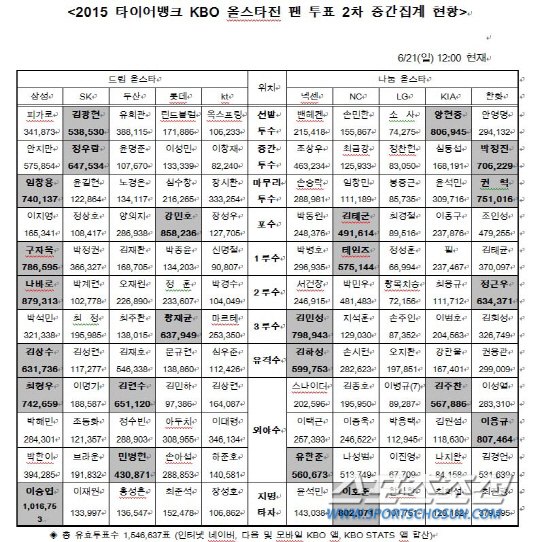 외국인 선수 중에서는 전체 최다 득표 2위인 나바로(87만9313표)와 함께 나눔 올스타(넥센,NC,LG,KIA,한화) 1루수 부문 후보인 NC 테임즈(57만5144표)가 '베스트 12'에 이름을 올렸다. 구단 별로는 삼성이 6명으로 가장 많고, 한화가 4명, 넥센과 NC가 각각 3명으로 그 뒤를 이었다. SK, 두산, 롯데, KIA가 각각 2명씩이며 LG와 kt는 아직 한 명도 선두에 오르지 못했다.