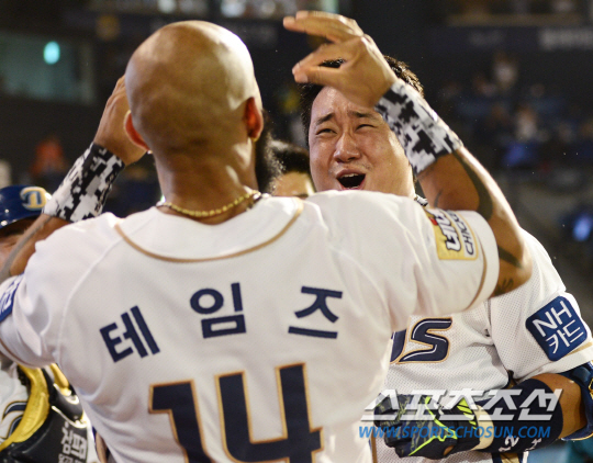 ◇한화 이글스와 NC 다이노스의 2015 프로야구 경기가 19일 마산구장에서 열렸다. 8회말 1사 NC 김태군이 좌중월 역전 솔로포를 치고 들어오며 동료 테임즈의 축하를 받고 있다. 테임즈는 팀내 분위기메이커다. 창원=정재근 기자 cjg@sportschosun.com