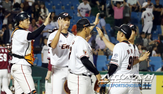 ◇한화 이글스가 23일 대전 한화생명 이글스파크에서 넥센 히어로즈를 상대로 3대1 승리를 거뒀다. 이로써 한화는 최근 5연패의 수렁에서 벗어났다. 승리가 결정된 후 하이파이브를 나누는 선수들. 사진=한화 이글스 제공