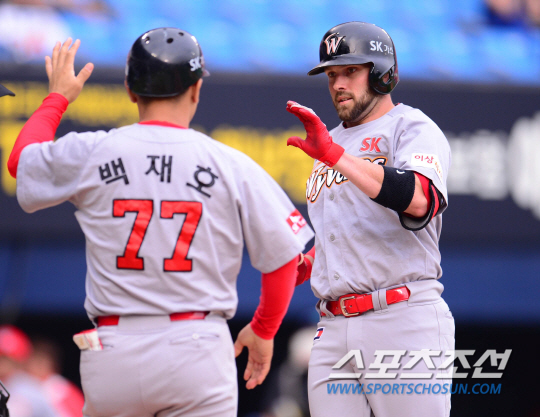 24일 서울 잠실야구장에서 2015 프로야구 SK와 두산의 경기가 열렸다. 1회초 2사 2루서 SK 브라운이 중월 2점 홈런을 친 후 홈에서 백재호 코치와 하이파이브를 나누고 있다. 잠실=김경민 기자 kyungmin@sportschosun.com