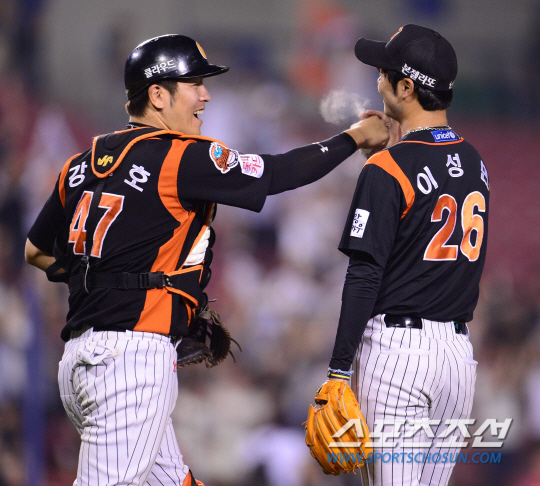 ◇롯데 강민호는 올해 최고의 해를 보내고 있다. 지난 19일 서울 잠실야구장에서 2015 프로야구 롯데와 두산의 경기가 열렸다. 4대3으로 승리한 후 롯데 강민호가 이성민과 하이파이브를 나누고 있다. 잠실=김경민 기자 kyungmin@sportschosun.com / 2015.06.19. |