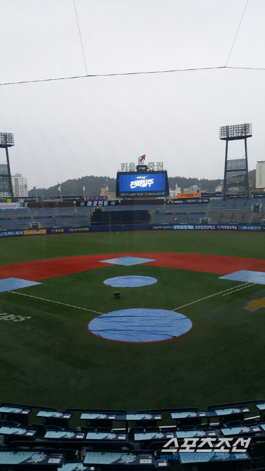 25일 창원 마산구장에서 열릴 예정이던 NC 다이노스-KIA 타이거즈전이 비로 취소됐다. 오후 5시쯤 시작된 비가 굵어지면서 원정팀 KIA 선수들은 훈련을 중단했고, 그라운드에 방수포가 깔렸다.