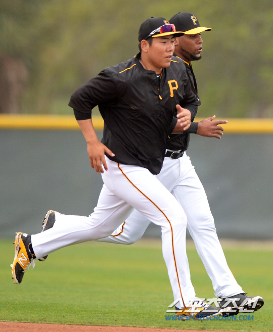 두산 베어스가 잭 루츠를 대신할 외국인 선수로 강정호와 함께 2015 MLB 스프링캠프에 함께했던 데이빈슨 로메로와 계약에 합의했다. 로메로는 1986년 9월24일생. 올해 28세로 도미니카 공화국 출신이고 1m85, 97㎏의 신체조건이다. 사진은 지난 2월 미국 플로리다 주 브래든턴에서 펼쳐진 피츠버그 파이어리츠의 스프링캠프에서 강정호와 함께 훈련을 펼치는 로메로의 모습.(맨 오른쪽) 허상욱 기자 wook@sportschosun.com