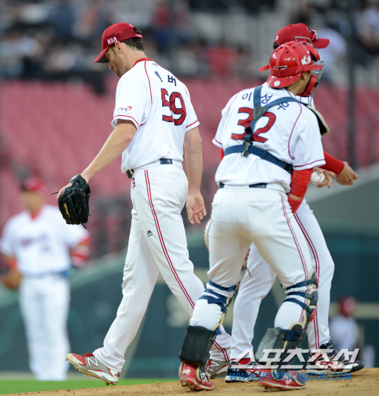 KIA와 두산의 2015 KBO 리그 주말 3연전 첫번째 경기가 26일 광주 기아챔피언스필드에서 열렸다. 1회초 KIA 험버가 마운드를 내려가고 있다. 광주=허상욱 기자 wook@sportschosun.com/2015.06.26/ |
