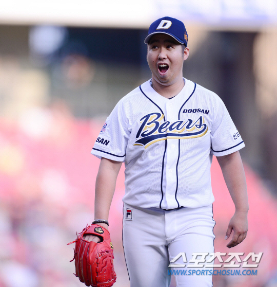 21일 서울 잠실야구장에서 2015 프로야구 두산과 롯데의 경기가 열렸다. 6회초 2사 1루서 롯데 아두치를 중견수 플라이 처리한 두산 유희관이 깜짝 놀란 얼굴을 하고 있다. 잠실=김경민 기자 kyungmin@sportschosun.com / 2015.06.21. |