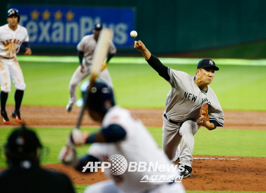 뉴욕 양키스의 우완투수 다나카 마사히로가 28일 휴스턴전 1회 루이스 발부에나를 상대로 공을 뿌리고 있다. ⓒAFPBBNews = News1