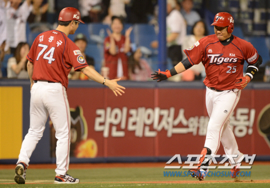 NC와 KIA의 2015 KBO 리그 주중 3연전 첫번째 경기가 23일 창원 마산구장에서 열렸다. 6회초 2사 1,3루 KIA 이범호가 NC 김진성의 투구를 받아쳐 좌측담장을 넘어가는 역전 3점홈런을 날렸다. 홈인하며 김종국 3루 코치와 기쁨을 나누는 이범호. 창원=허상욱 기자 wook@sportschosun.com/2015.06.23/