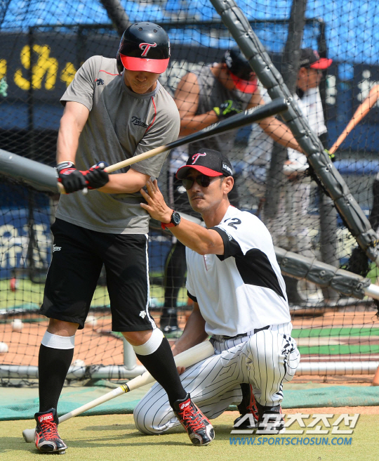 2015 KBO리그 LG트윈스와 NC다이노스의 경기가 28일 서울 잠실야구장에서 열렸다. 경기전 LG 서용빈 코치가 이민재의 타격자세를 지도하고 있다. 잠실=최문영 기자 deer@sportschosun.com /2015.06,28/