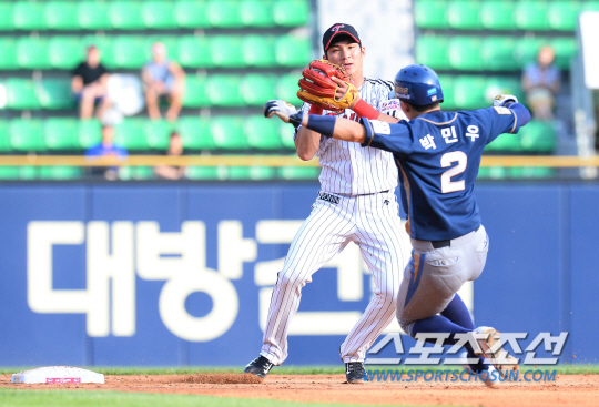 2015 KBO리그 LG트윈스와 NC다이노스의 경기가 28일 서울 잠실야구장에서 열렸다. LG 포수 유강남이 3회초 1사 1,2루에서 나성범의 내땅때 1루주자 박민우가 2루에서 포스아웃되고 있다. 잠실=최문영 기자 deer@sportschosun.com