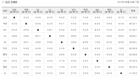 | 팀간 승패표, 6월29일 현재 |