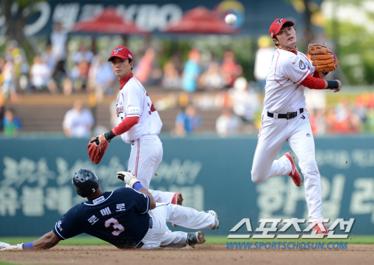 KIA와 두산의 2015 KBO 리그 주말 3연전 마지막 경기가 28일 광주 기아챔피언스필드에서 열렸다. 1회초 1사 1,2루 두산 오재원의 내야땅볼때 1루주자 로메로가 2루 포스아웃되고 있다. KIA 유격수는 김민우. 광주=허상욱 기자 wook@sportschosun.com/2015.06.28/